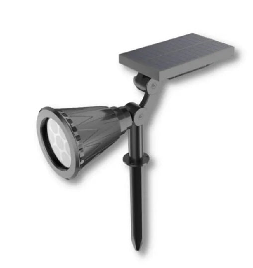 Solar outdoor spot lights with inbuilt battery and panel. Pre-set dimming profiles to