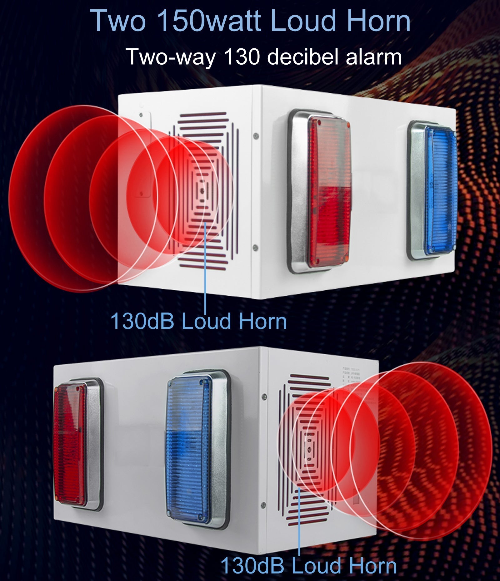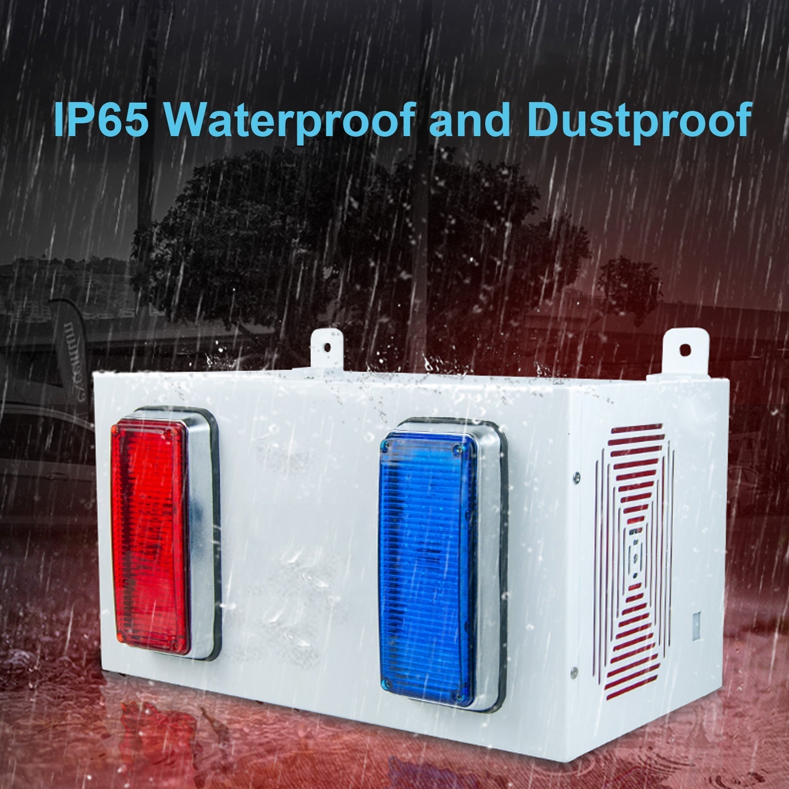 Features of the outdoor siren The alarm siren is equipped with two 150-watt high-power speakers, with a longer propagation distance (about 300 meters) and a clearer alarm sound! The front LED red and blue flash light makes the warning effect more obvious! 0-130db adjustable alarm tone, built-in 9 tones, you can upload your own voice!