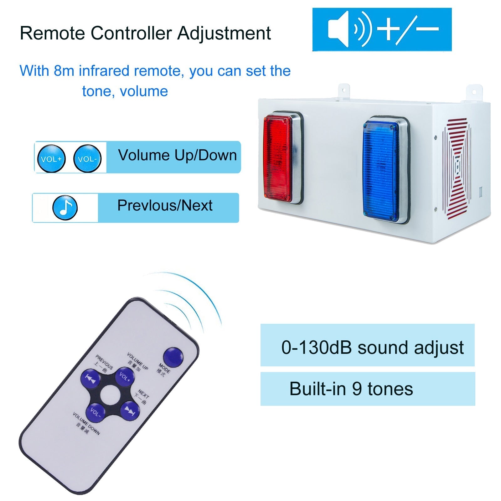 Adjustable sound and tone 0-130db adjustable alarm, you can choose the volume according to your needs (adjusted by the remote control); the siren has 9 built-in tones, you can choose your favorite tone through the remote control; there is also a USB port, you can upload your own voice to the siren.