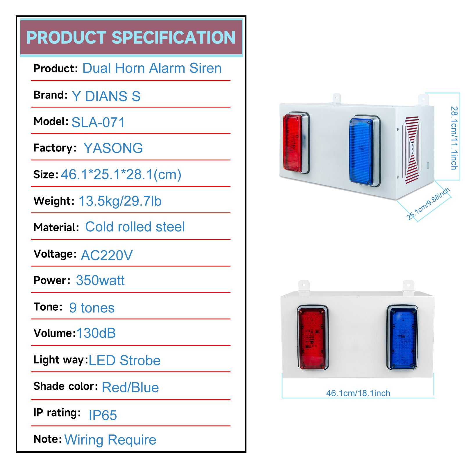 YASONG 350watt Alarm Siren 130dB Dual Horn 9 Tone Adjust High Power Alarm Systerm for Emergency Alarm Range Approximately of 300 Meters SLA-O71